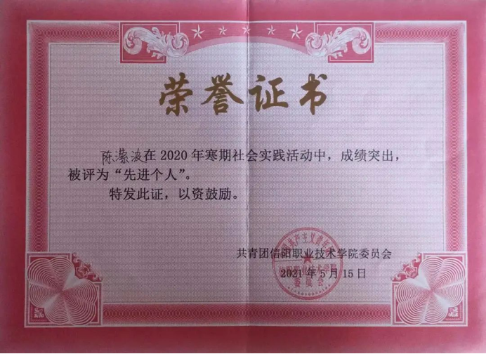 获奖情况:“河南省优秀共青团员”“河南省优秀学生干部” “信阳市优秀共青团员” “魅力团支书” “三好学生”“优秀共青团干部”“社会实践先进个人”等