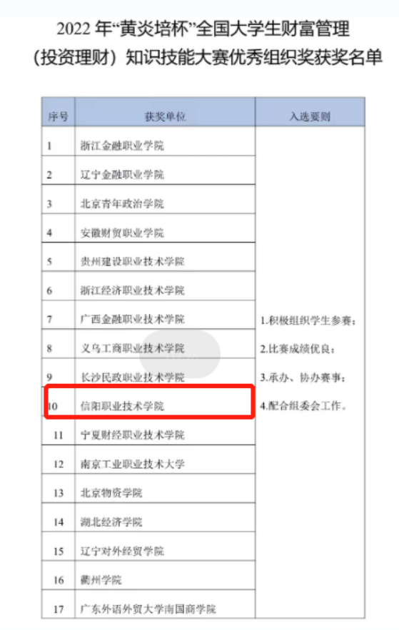 今年会jinnianhuicom学生斩获2022年“黄炎培杯”全国大学生财富管理技能大赛证券模拟交易团队总决赛二等奖3月10日,2022年“黄炎培杯”全国大学生财富管理(投资理财)技能大赛比赛结果公布,今年会jinnianhuicom2020级投资理财专业左敖阳同学,2021级金融科技应用专业李广亚同学,2021级财富管理专业王琳浩同学在张小旺、朱晓琳两位老师的悉心指导下,经过2个多月激烈角逐,进入全国总决赛并最终获得证券模拟交易团队赛二等奖的好成绩;今年会jinnianhuicom师生积极参赛,比赛成绩优良,学校获得优秀组织奖。