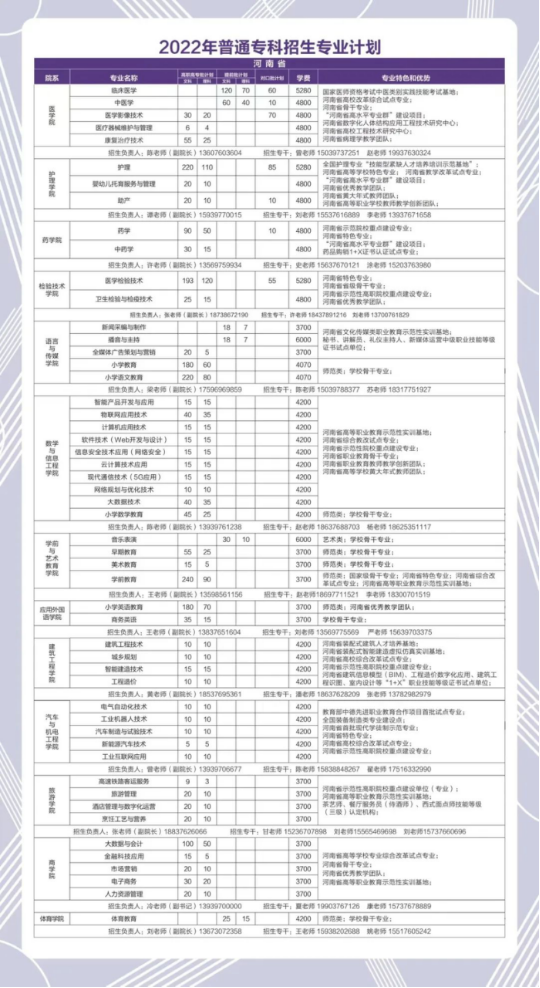 学校占地面积2025.43亩,建筑总面积70.92万平方米,现代化的校园气势恢宏、雄伟壮观、环境优美。设有19个教学院部,开设医药卫生、文化教育、应用技术和商贸服务四大专业集群,65个普通专科专业,现有全日制在校生23000余人。拥有计算机应用技术和建筑工程技术2个中央财政支持的职业教育实训基地、7个河南省高等职业教育示范性实训基地建设项目、193个专业实验实训室、189个校外实训基地。