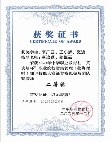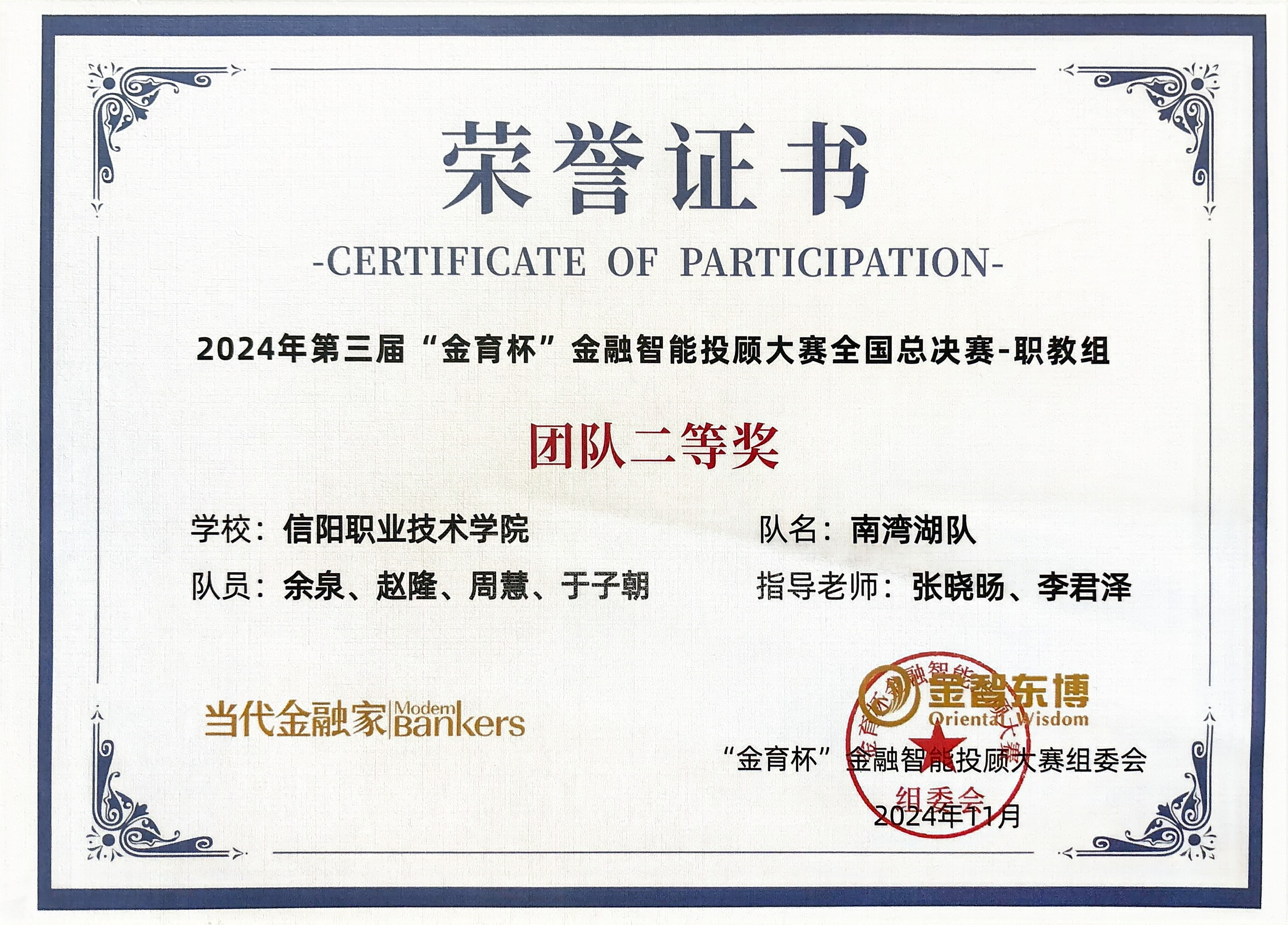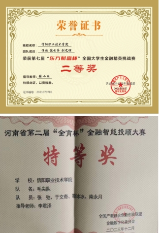金融科技应用金融专业学生在东方财富杯全国大学生金融挑战赛中多次获得优异成绩;在中华职业教育社“黄炎培杯”职业院校财富管理(投资理财)知识技能大赛中多次取得优秀成绩;大赛中多次取得优秀成绩;2023年参加第二届金融智能投顾竞赛获得省赛特等奖;参加2023年金融科技应用专业学生首次参加河南省智慧金融技能竞赛,参加的3个代表队均获得省赛二等奖的成绩;参加2024年第三届“金育杯”金融智能投顾大赛获国赛二等奖。