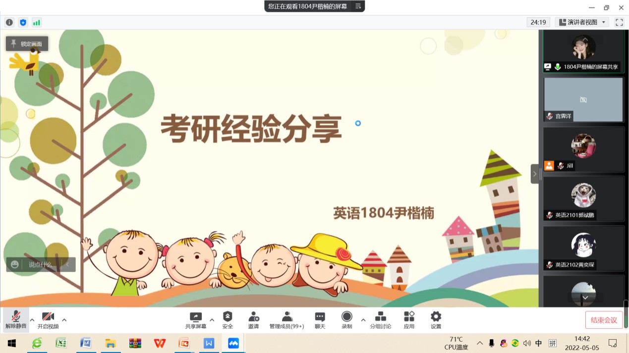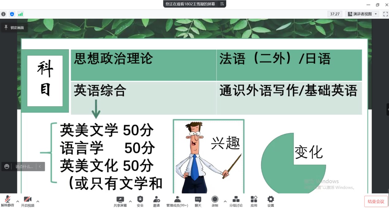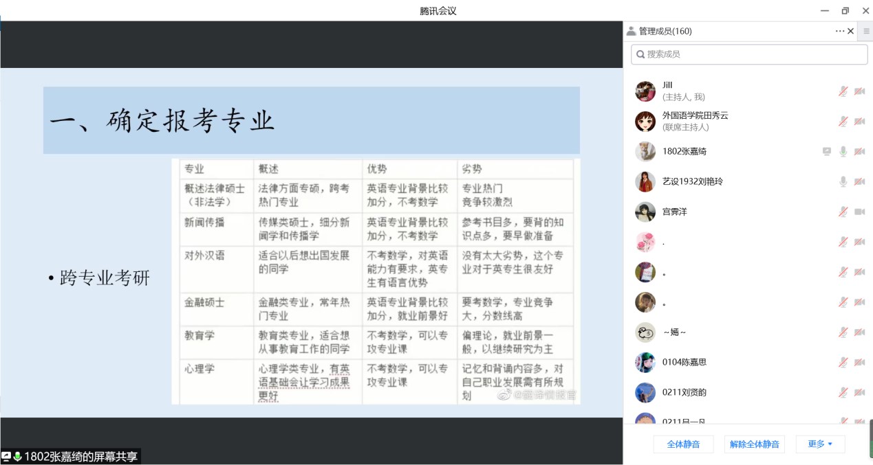 2022年5月5日下午,8455新葡萄场网站英语专业通过腾讯会议召开了考研暨就业交流会。会议由教学部主任王静老师主持,邀请2018级9位成功考取硕士研究生以及顺利就业的学生交流心得和分享经验,2019级、2020级以及2021级170余名学生与会交流。学长从选择考研学校和专业、复习备考、调剂学校、就业和备考教资五个方面分享了自己的经验,并鼓励学弟学妹们平时注重知识积累和能力培养。