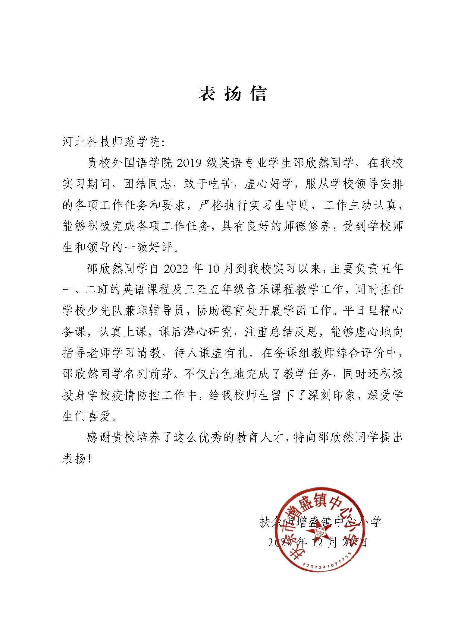 近日,吉林省扶余市增盛镇中心小学向我校发来表扬信,感谢新葡萄官网英语专业邵欣然同学在该校出色地完成顶岗实习任务。