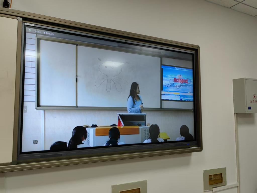 目前在秦皇岛市第二中学实习的8455新葡萄场网站的学科教学(英语)研究生李学美讲授的内容是Unit 1 Animal Friends—The Amazing Octopus阅读课。李老师以章鱼视频为导入,鲜活地为学生们展示了章鱼的外貌特征、生活习性等特点。李老师以活动为导向,逐步对语篇进行深入地分析、挖掘语篇主题意义,让学生们在学习文本的同时对海洋世界的多样性和重要性有了进一步的了解,唤醒了学生们保护海洋环境的意识。
