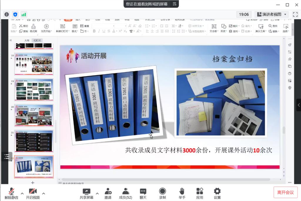 4月30日下午13:508455新葡萄场网站19-21级全体团干进入腾讯会议,进行签到。仪式开始,进行活动第一项内容,打团旗唱团歌;活动第二项,由两个上一年度校级一团一品的团支书讲述和分享了本支部“一团一品”的创建方案和实施计划,以及创建过程中可能会遇到的问题。英语1904团支部的团支书牛嘉浩表示,在校级一团一品特色团支部活动中,支部成员要团结互助,齐心协力,共同打造出优质、特色、新意的品牌项目活动。最后,由青年发展部负责人张梦盼发表总结讲话,表示对各支部“一团一品”活动的极高热情表示欣慰,期盼着各支部成员将支部创建成积极向上的、具有强大影响力的团支部!