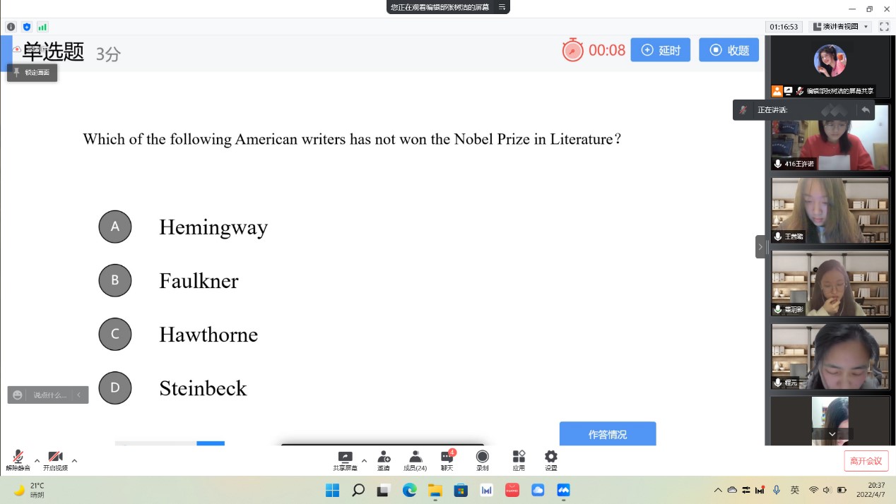 为了提高外语学子的文学素养,丰富学生的课余生活,4月7日下午,8455新葡萄场网站以线上会议形式举办第一届“畅游文学,横贯中外”中西文学知识竞赛,本次竞赛由《中学英语》外编社承办,外编社指导老师周鹏宇作为嘉宾出席本次竞赛。