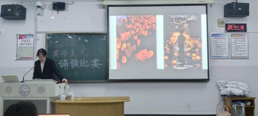 本次于线下举行英语美文诵读比赛,所有参加人员悉数到位。首先组织到场选手进行纸质版签到,以此作为选手上场依据。每位同学都准备得十分充分,上场时携带自己准备好的背景音乐以及PPT,在这过程中,评委们一边用心倾听,一边认真地按照评分标准为每位选手打分,不时地为选手的表现作出点评,选手们也仔细倾听评委的建议,并在日后作出适当的调整。每位选手比赛结束后即可获悉自己的得分。最后,待所有选手比赛结束后宣告比赛的圆满落幕。诵读活动结束后,同学们讨论热烈,积极交换着彼此对本次诵读比赛活动的见解与感悟。此次英语美文诵读活动的开展,极大地调动了同学们的读书热情,营造了健康的校园文化氛围,引导了积极的求学风尚。本次交流不仅是为了满足我们大学生的文化需求,更是为了鼓励同学们在日常的学习生活中大声诵读,读出自己的力量。