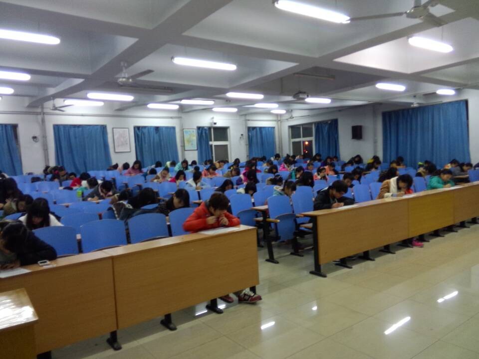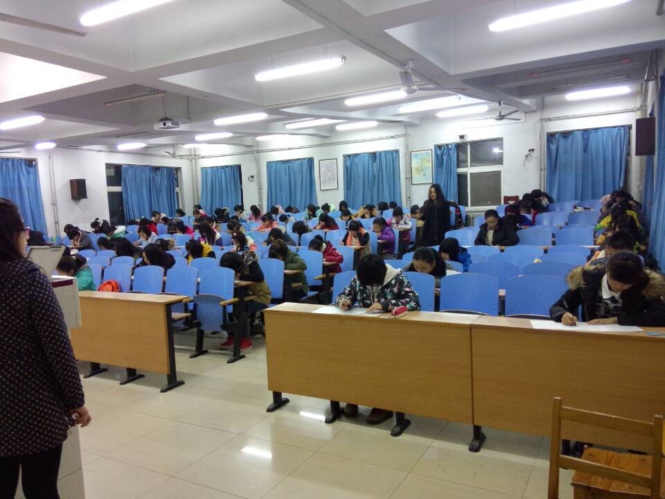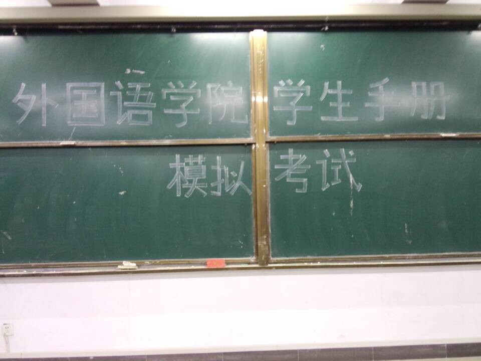 考试开始前,各个新生班级有序进入考场,其中,英本1401班、英本1402班、英本1403班在118考场;英本1404班、专接本1405班、专接本1406班在212考场;语言文化类1401班、语言文化类1402班、应日1401班在312考场;意大利语1401班、语言文化类1403班在710考场。七点钟考试正式开始。全体新生准备好一卡通,按照学号在自己的位置上就坐,随后监考人员分发试卷,提出考试注意事项。整场考试在严肃认真的气氛中进行着。有的同学准备充分,奋笔疾书,有的同学认真审题,静静思考。在考试中只能听到纸笔接触的沙沙声和翻动试卷的声音。监考人员在考场内流动查看,认真负责的对待监考工作。