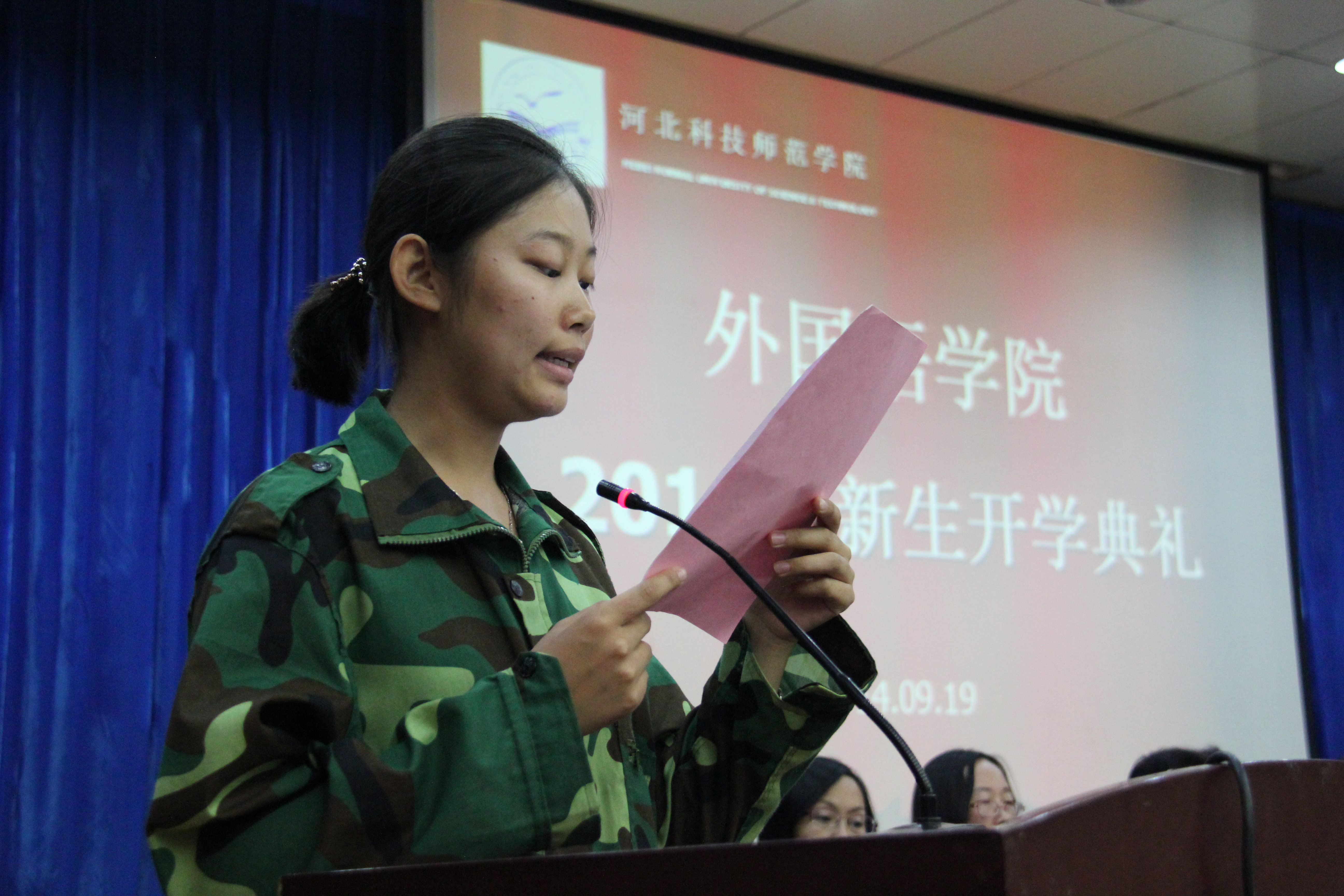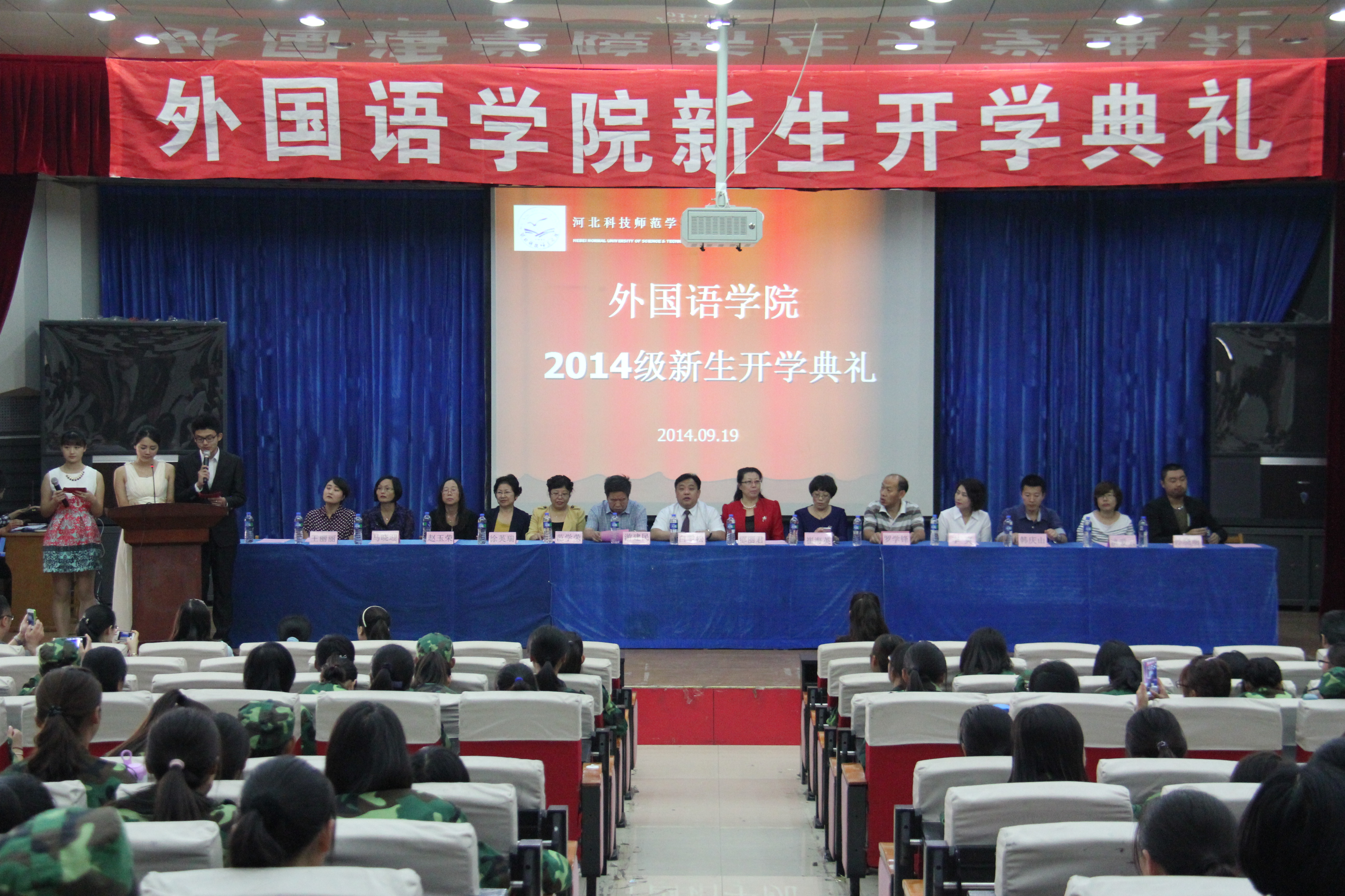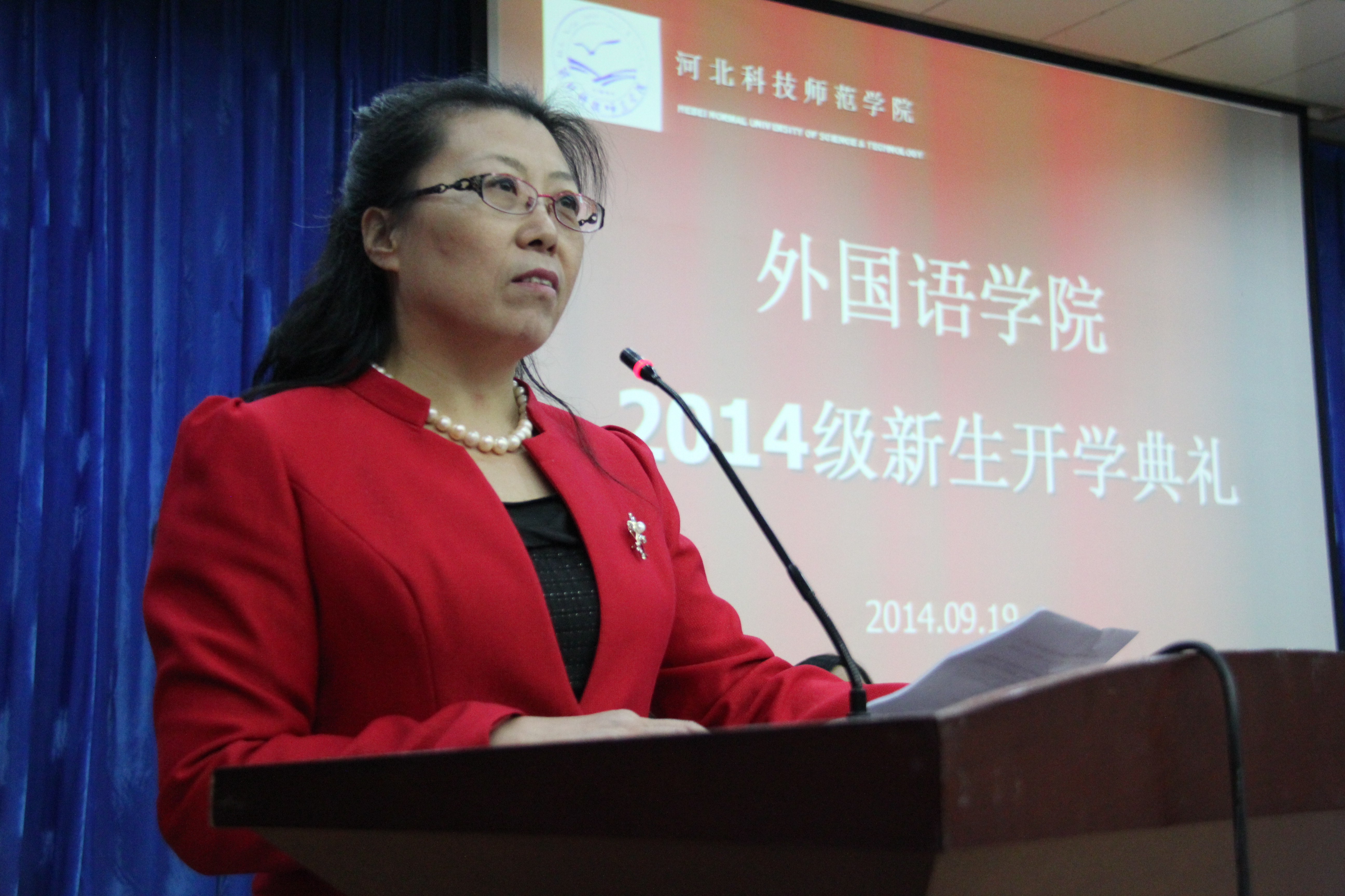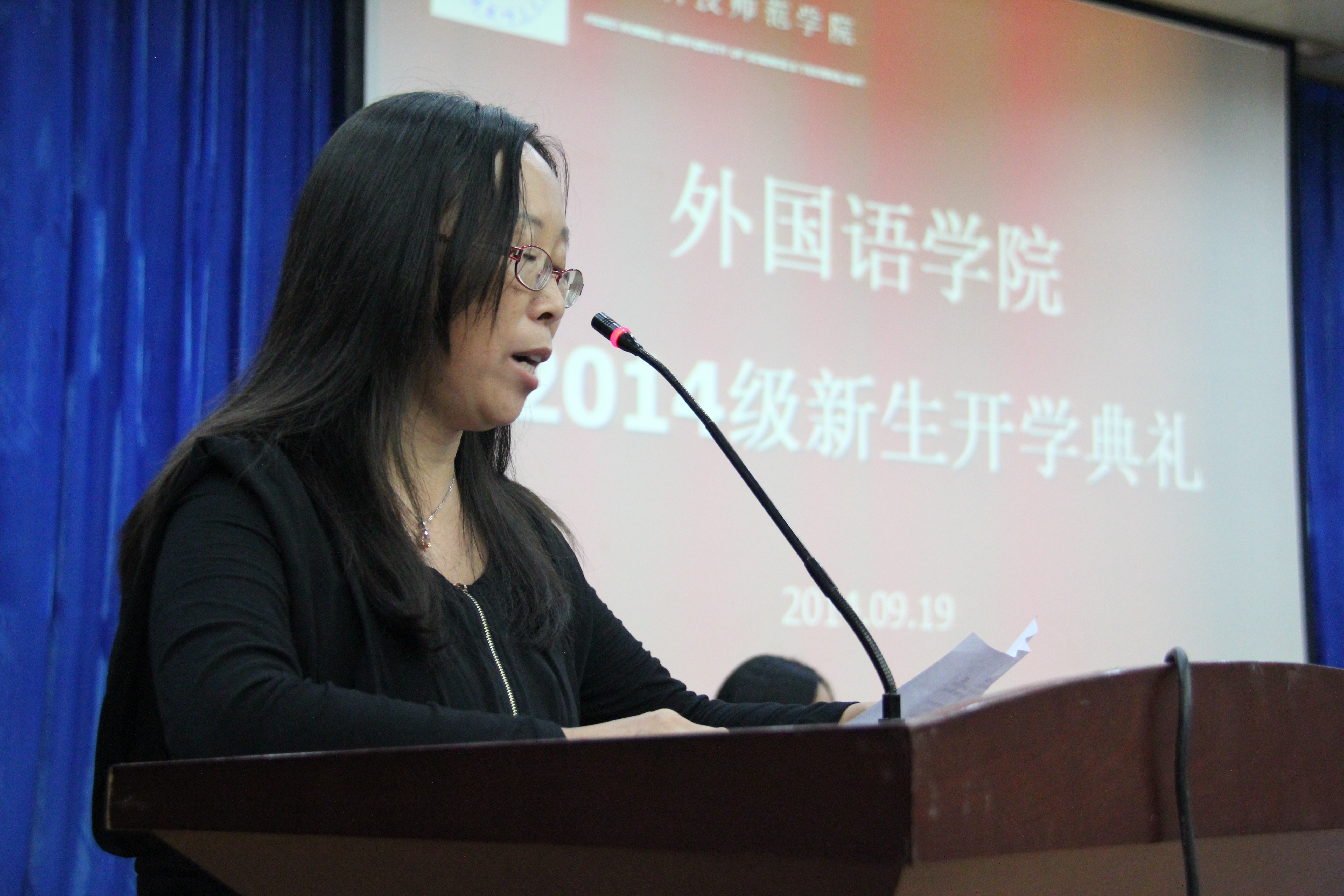 首先,学院院长邵丽君老师为开学典礼致开幕词,她对新生表示衷心的祝贺和热烈的欢迎,并简要介绍了学院的概况及往届学生所取得的优秀成绩,并对2014级新生在学校未来的发展提出了深切的希望。清华大学英语语言学博士,副教授赵玉荣老师代表全体教师对新生表达祝贺,对新生大学学习生活给予殷切的希望。老生代表野海清同学和师弟师妹们分享了大学的生活经验。新生代表2014级英语01班王汝鑫同学代表全体新生畅谈了自己对大学的憧憬和梦想。之后,8455新葡萄场网站各教学部主任及专业教师代表分别用英语、日语、意大利语、俄语、法语等专业语言以向新生致以祝愿,形式新颖,赢得新生的阵阵掌声。最后,8455新葡萄场网站党委书记白雪松老师用质朴的语言表达了对新生最热切的欢迎和希望,他要求同学们科学规划人生,加强知识储备;加强个人修养,增强事业心和责任感;常怀感恩之心,用知识和学识去回报社会;要努力奋斗,勇于创新创造,并强调“今天你以学校为骄傲,明天学校以你而自豪”。
