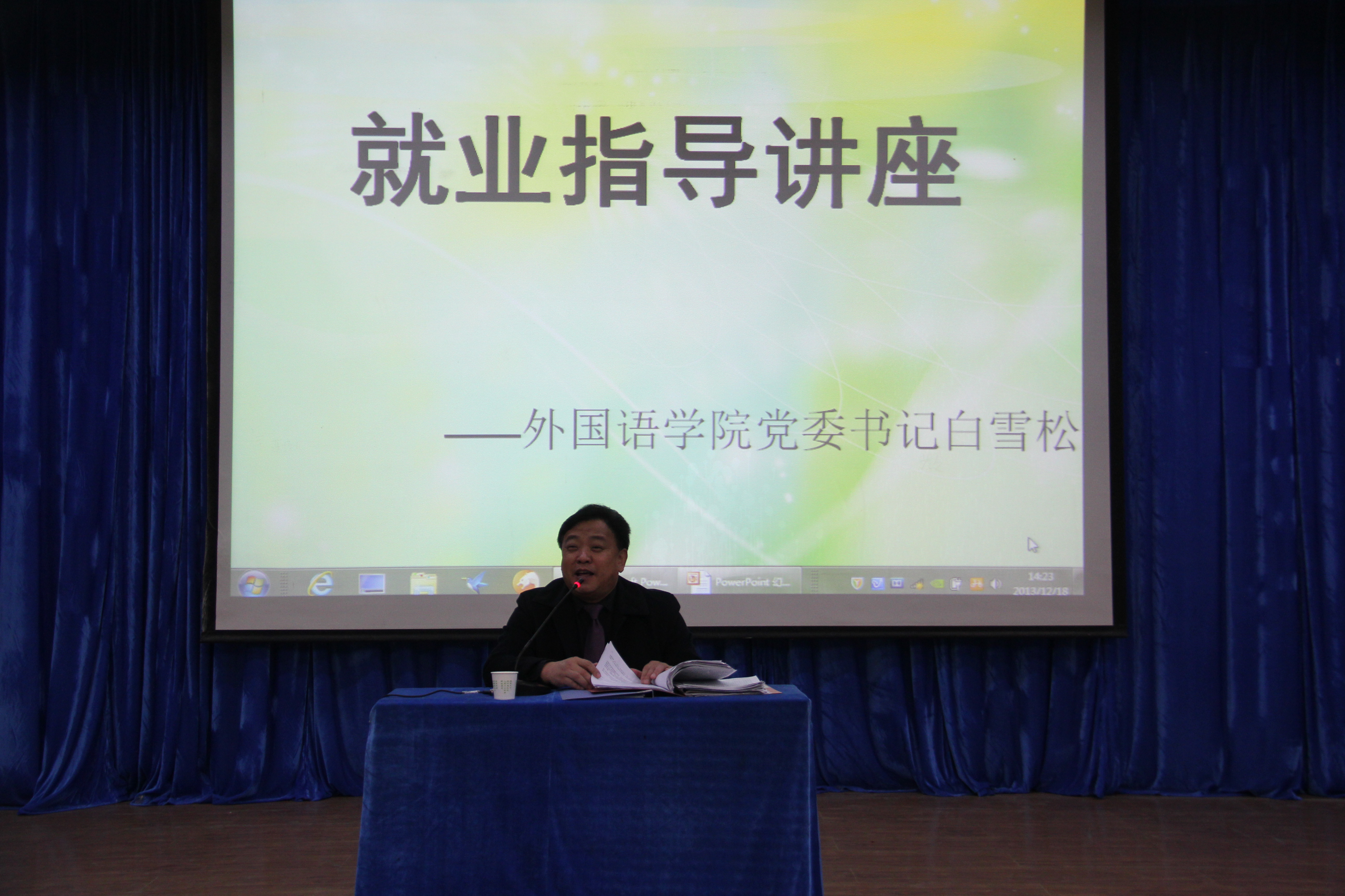 2013年12月18日下午两点,8455新葡萄场网站8455新葡萄场网站党委书记白雪松老师在二楼报告厅给全体毕业生做了一场以“2014届毕业生就业形势分析”为主题的讲座。班级辅导员以及学工办各位老师参加了本次讲座。