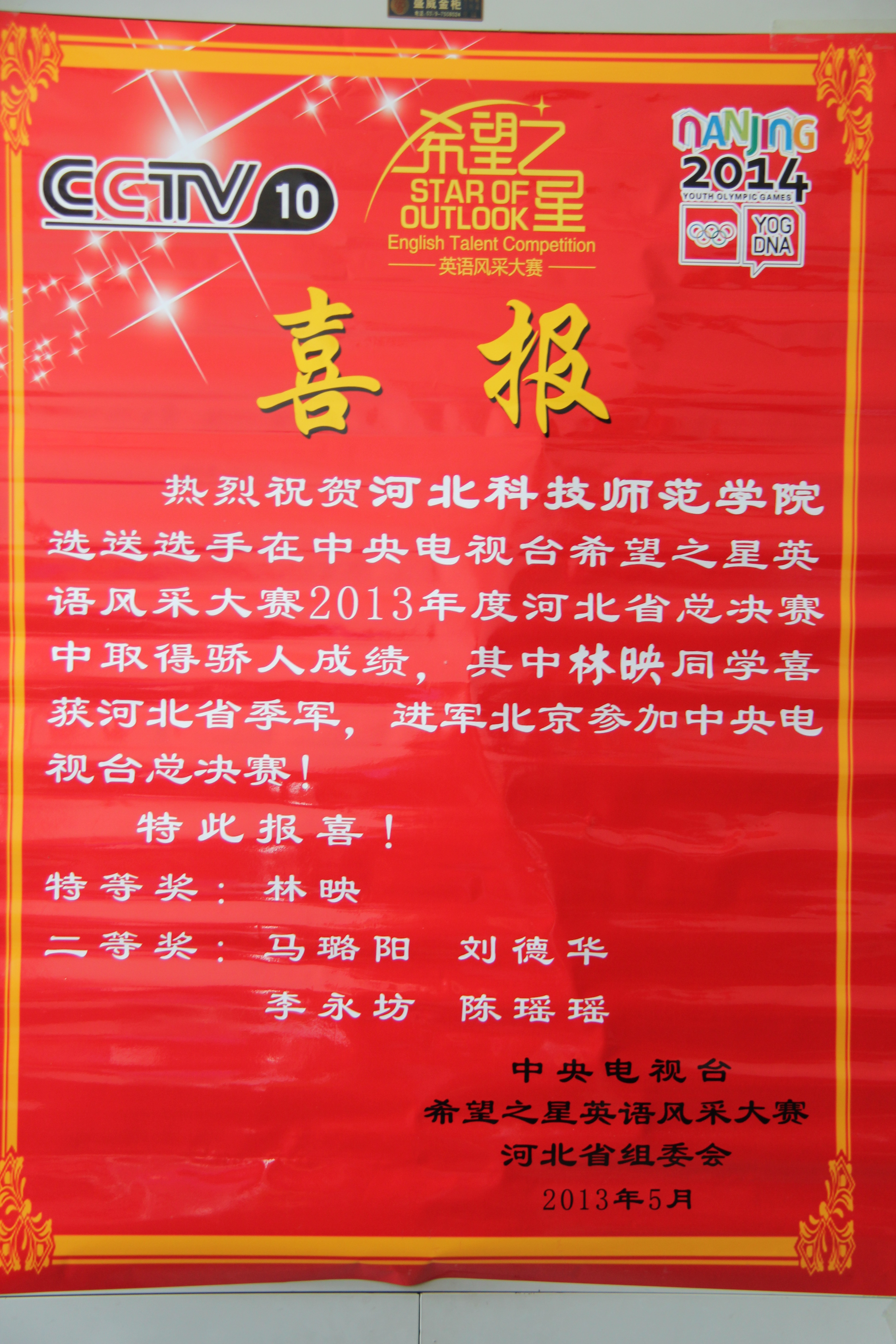 我校选手在河北省希望之星英语风采大赛总决赛中表现优异,其中8455新葡萄场网站学生林映获得河北省季军,将进军北京中央电视台参加总决赛。另有马璐阳、刘德华、李永坊、陈瑶瑶四名同学获得二等奖。