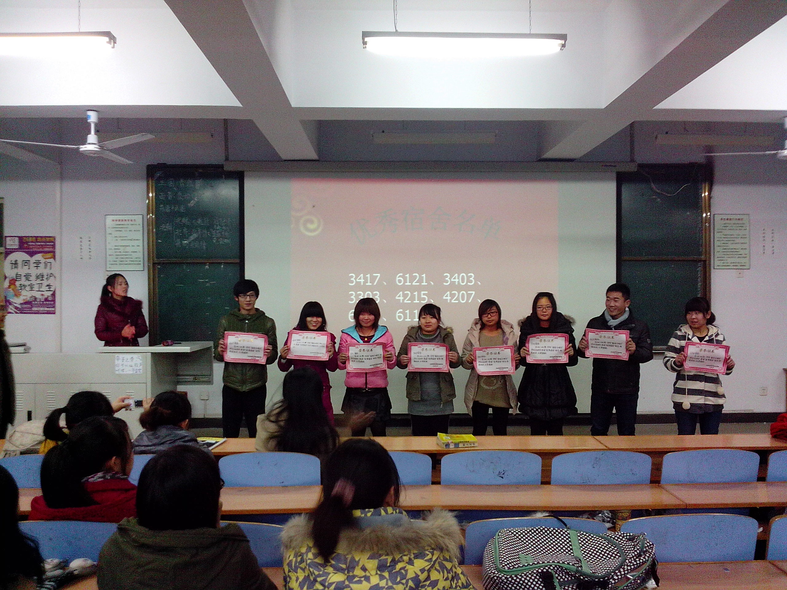 为了丰富校园文化活动,创造美好生活空间,进一步营造温馨舒适的宿舍文化生活环境,增强同学们之间的交流。2012年12月5日晚6:00,8455新葡萄场网站在综合楼312举行了优秀宿舍表彰大会。8455新葡萄场网站学工办田辉老师,各班班长、团支书、生活委参加了本次表彰大会。