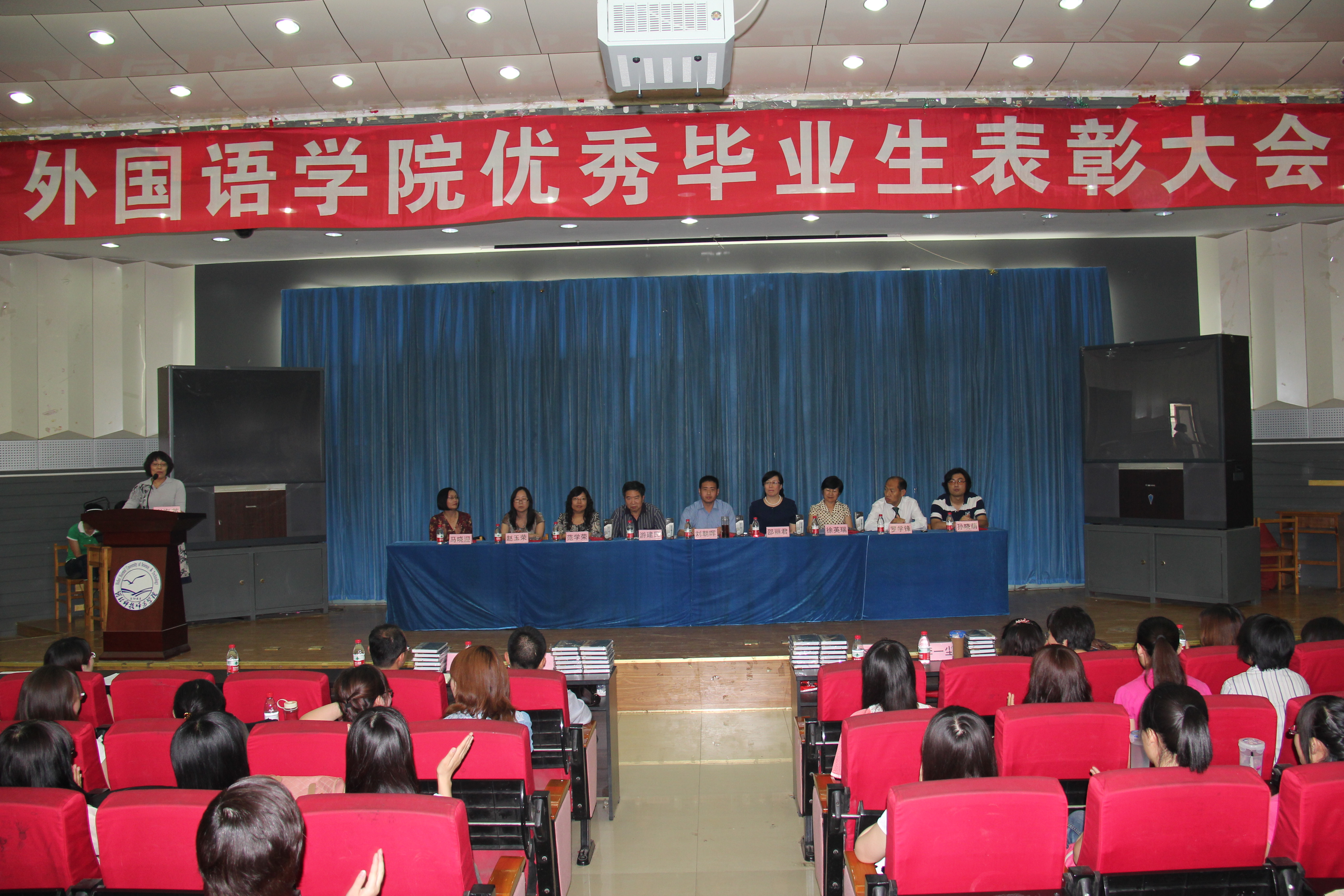 为进一步加强学风建设,树立典型,充分发挥优秀毕业生的示范激励作用,同时鼓舞学院学生考研的积极性和主动性,8455新葡萄场网站于6月12日在开发区学术报告厅召开2012届优秀毕业生表彰大会。大会由8455新葡萄场网站副院长崔海英副教授主持。出席大会的领导和老师有8455新葡萄场网站党委书记刘朝晖老师、院长邵丽君教授、副院长游建民教授、英语本科教学部主任范学荣副教授以及教师代表徐英瑞教授、赵玉荣博士、罗学锋副教授、马晓迎副教授、孙晓萌老师。另外参加表彰会的还有我校2010届优秀毕业生、现任海港区政协委员、大学生村官、海港区海阳镇海阳四村党支部副书记、海天考研培训学校营销部张超经理。09、10级全体本科生参加了大会。表彰大会由8455新葡萄场网站副院长崔海英老师主持。