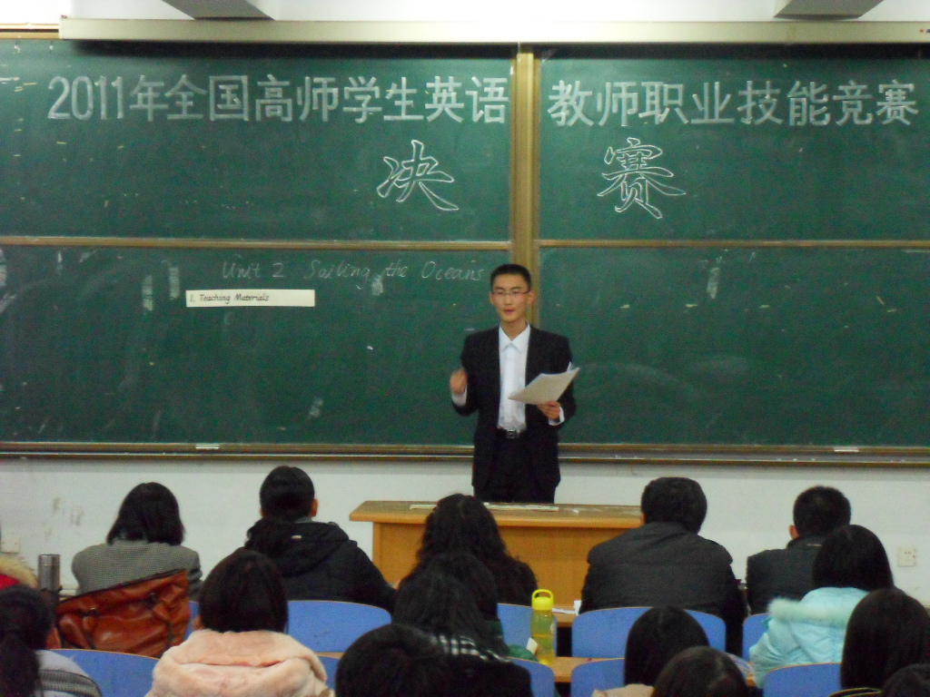 2011年全国高师学生英语教师职业技能竞赛于12月10日下午两点半在开发区312教室成功举行。本次比赛邀请8455新葡萄场网站副院长游建民、副院长崔海英及赵建平、王力、韩庆山老师担当评委。比赛分两个环节,共13位选手进入到决赛。所有选手在遵循公平、公正原则的基础上抽签决定参赛顺序,并随机抽取题目参加比赛。各位选手用流利的英语、丰富的肢体语言及多种多样的讲课方式展现了她们的英语运用能力和临场应变能力,赢得了阵阵掌声,台下同学也积极配合,气氛十分活跃。认真负责的五位评委老师公正客观地为各位选手打分,并做了精彩点评,使各位选手和现场观众都受益匪浅。本次活动的成功举办为选手们提供了展示自我风采的平台和锻炼提升的机会。附比赛结果: