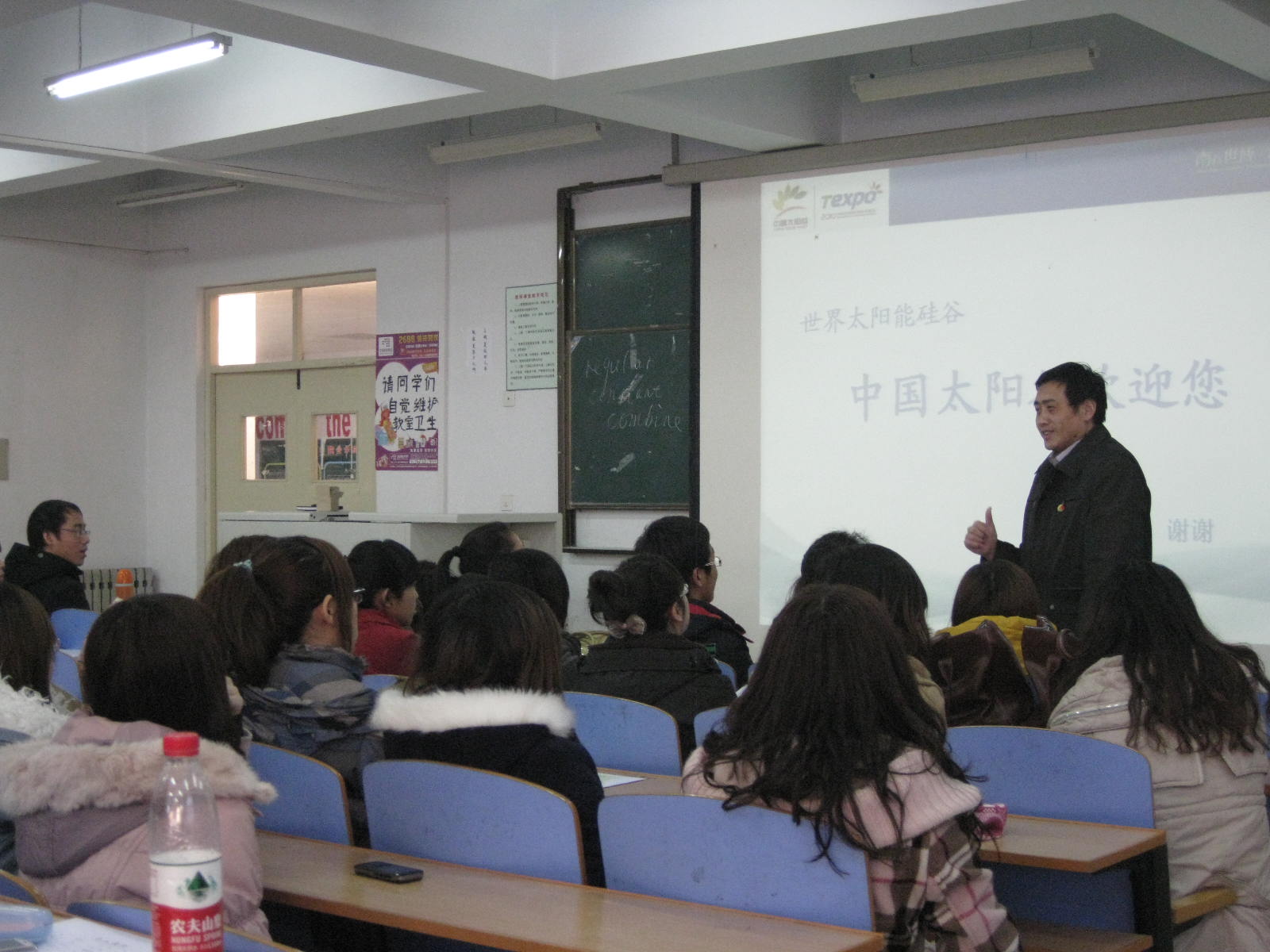 首先,皇明太阳能股份公司的招聘代表佟女士为毕业生播放皇明太阳能“太阳谷”的宣传片,之后将皇明太阳能股份有限公司的公司规模、产品研发、产业布局、发展前景、招聘岗位、基本待遇等情况向毕业生做了较为详细的讲解,并诚挚的邀请8455新葡萄场网站的学生加入皇明,同时也欢迎大家有机会去皇明公司参观考察和实习。讲解后,刘朝晖书记代表学院欢迎皇明太阳能股份有限公司佟女士一行,并谈到自己去皇明公司考察的经历,要求全体毕业生转变观念,面向市场。通过对行业和企业的分析,鼓励大家去皇明太阳能实习就业。