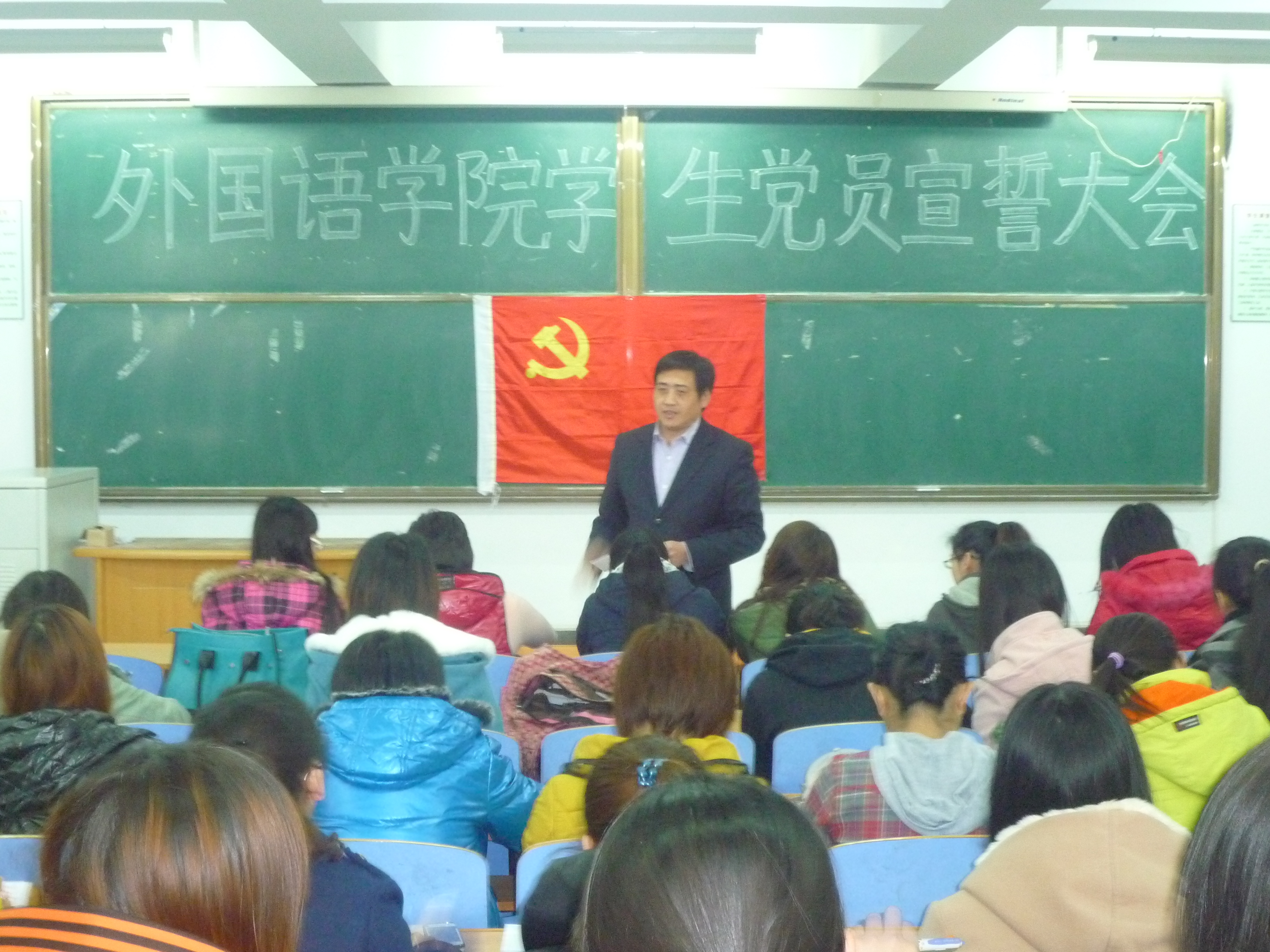 为了加强学生党员党性,深化学生党员的理论学习,2012年3月22日中午国语学院学生党支部在312教室召开了学生党员宣誓大会,会议由学生支部书记田辉同志主持,8455新葡萄场网站党总支书记刘朝晖同志、团委书记李一尘同志和全体学生党员参加。