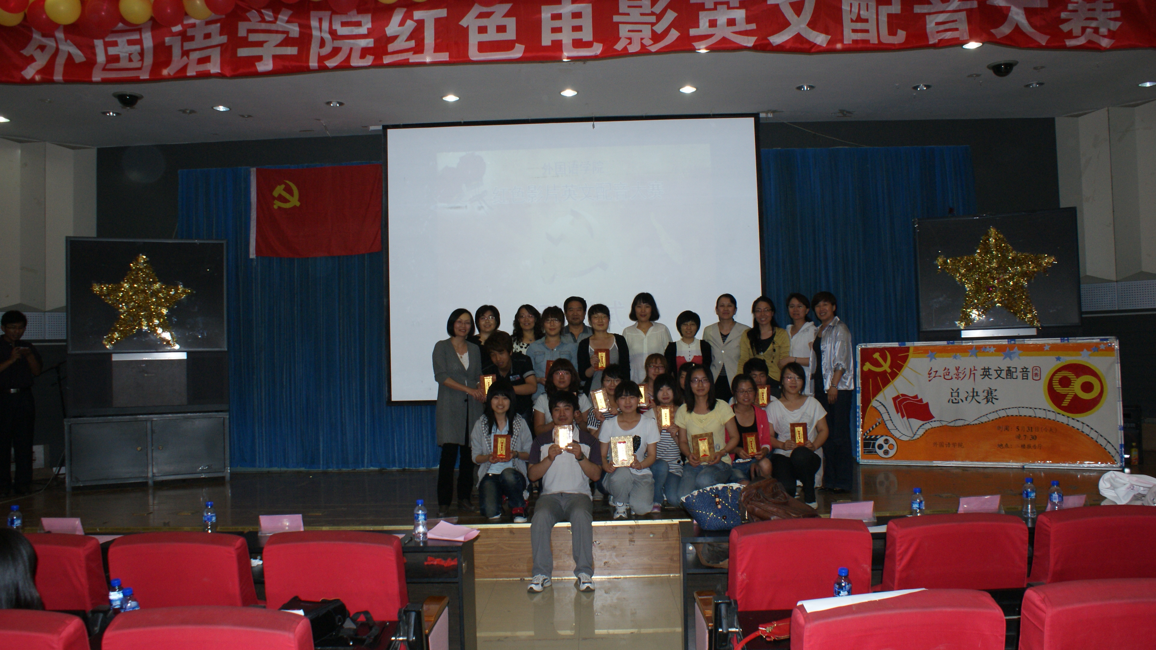 2011年5月31日晚,由8455新葡萄场网站8455新葡萄场网站主办的2011年第一届红色影片英文配音大赛在开发区校区学术报告厅隆重举行。担任本次比赛的评委有8455新葡萄场网站应用英语教学部主任马晓迎老师,商务英语教学部主任洪爱云老师,专业英语教学部刘丽敏老师、宋洁老师,公共外语教学部樊荣萍老师、罗翠丽老师、王力老师。出席本次比赛的嘉宾有8455新葡萄场网站党委书记刘朝晖老师,8455新葡萄场网站党委副书记、副院长宋文华老师,8455新葡萄场网站副院长游建民,8455新葡萄场网站副院长崔海英老师,四百余名学生出席观看了本次大赛。