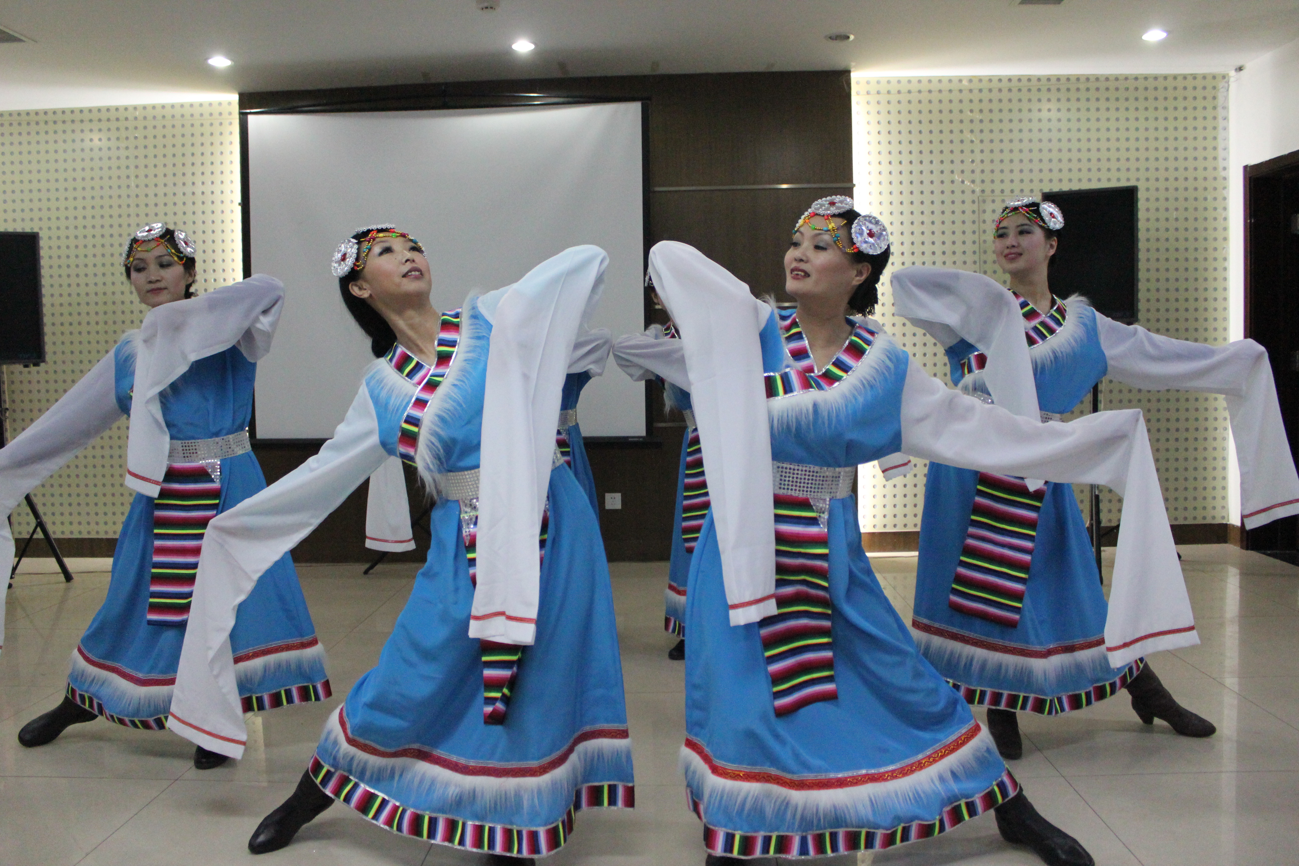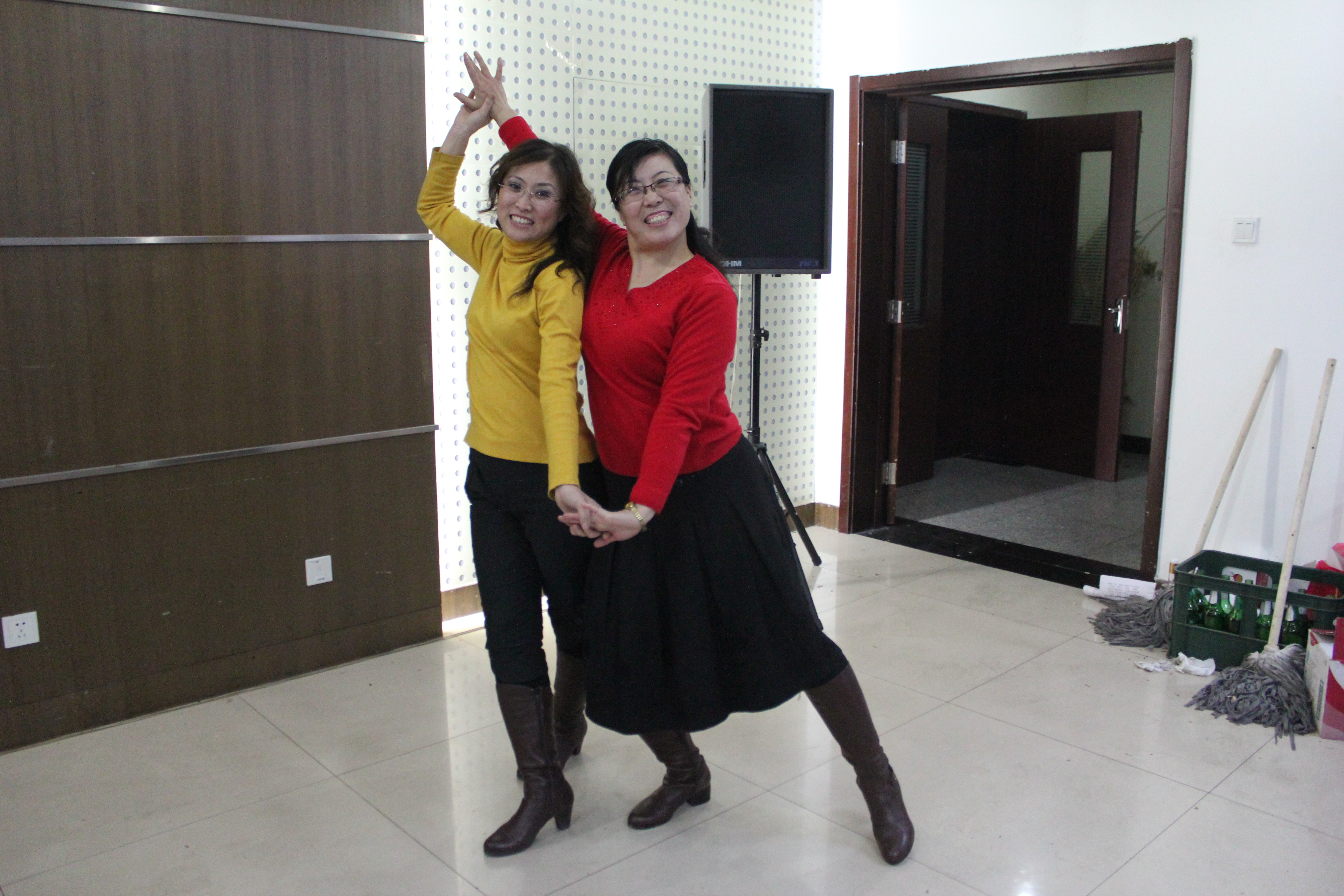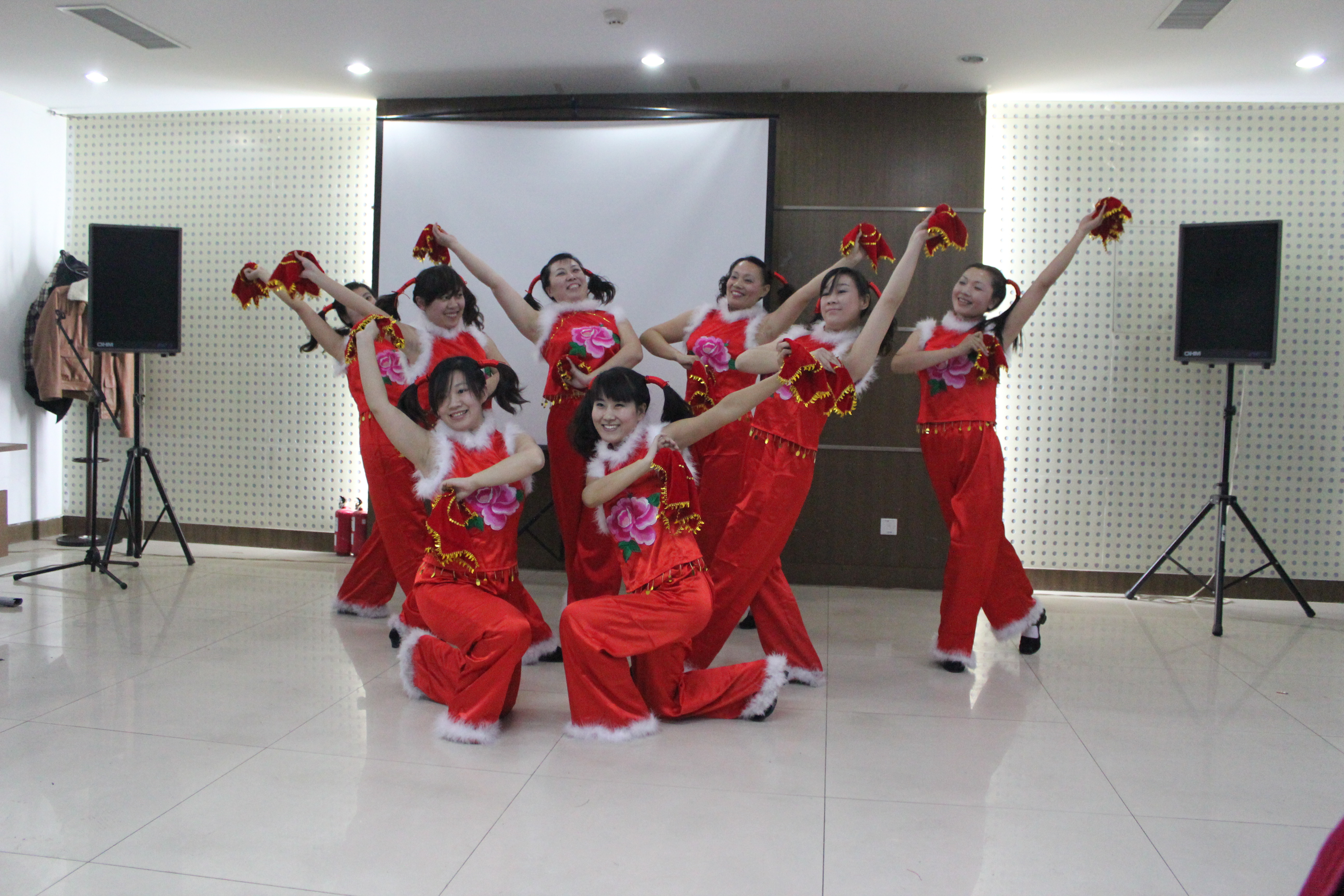 联欢会在院党委书记刘朝晖同志幽默、给力的致辞声中开始。在主持人邵东蕊和孙晓萌铿锵有力的声音引导下,教师们精心准备的节目依次上演:以马晓迎老师为首的应用英语教研室的老师们带领在场的其他老师们做起了第八套广播体操,让大家重温了青春岁月;两个曾经的老兵游建民和吴玉新老师又重新“扛起了革命的枪”;办公室与学工办的老师们联手为大家献上了一出“杨白劳与黄世仁”;以邵院长和崔院长为首的“舞蹈家”们为大家跳了一段精彩火爆的舞蹈-开门红;郭文颖、李爽等几位老师的舞蹈“吉祥谣”在联欢会上吹起了一股藏族风,“谋杀”胶卷无数。本次联欢会精彩纷呈,教师们纷纷上台表演,唱歌跳舞,说拉弹唱,真是丰富多彩,就像刘朝晖书记所说的那样:老师们纷纷一改往日的严肃,真正的做到了“颠覆自我”。