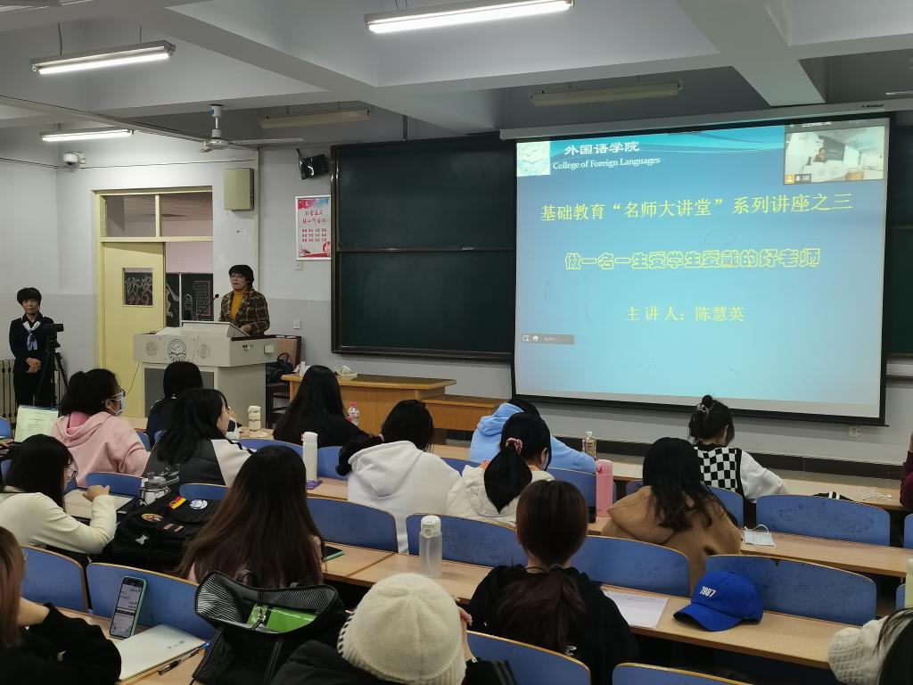 2021年11月18日下午,8455新葡萄场网站在综合楼312召开了英语专业2020级教育见习师德与教师角色专题讲座,此次讲座是新葡萄官网“名师大讲堂”的系列讲座之三。特邀主讲人为秦皇岛市海港区教体局高级教师陈慧英老师,陈老师是英语专业2020级的校外导师,河北省中小学省级培训专家团队成员、秦皇岛市首批学科带头人。