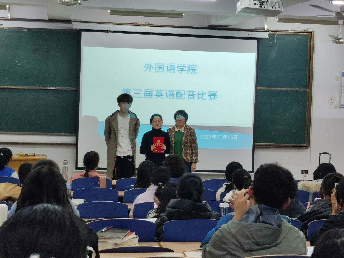 比赛开始前,学生会工作人员布置场地,进行多媒体设备的调试,并引导各位评委老师、比赛选手和观众有序入场。比赛开始后,主持人宣布比赛规则及流程,参赛选手有序上台进行比赛,配音展示后由评委老师对小组表现进行打分,工作人员核算得分。经过近两个小时的角逐,最终产生一等奖两组、二等奖四组、三等奖六组:《爱丽丝梦游仙境》组、《疯狂动物城》组荣获一等奖;《寻梦环游记》《功夫熊猫》等组荣获二等奖;《疯狂动物城》《飞屋环游记》《灰姑娘》等组荣获三等奖。赛后评委为获奖小组颁发荣誉证书。崔海英院长对同学们精彩的表现表示由衷地赞赏,并从规范发音、投入演绎、团队合作等方面对大家的表现给出中肯地点评,学生们收获颇丰。