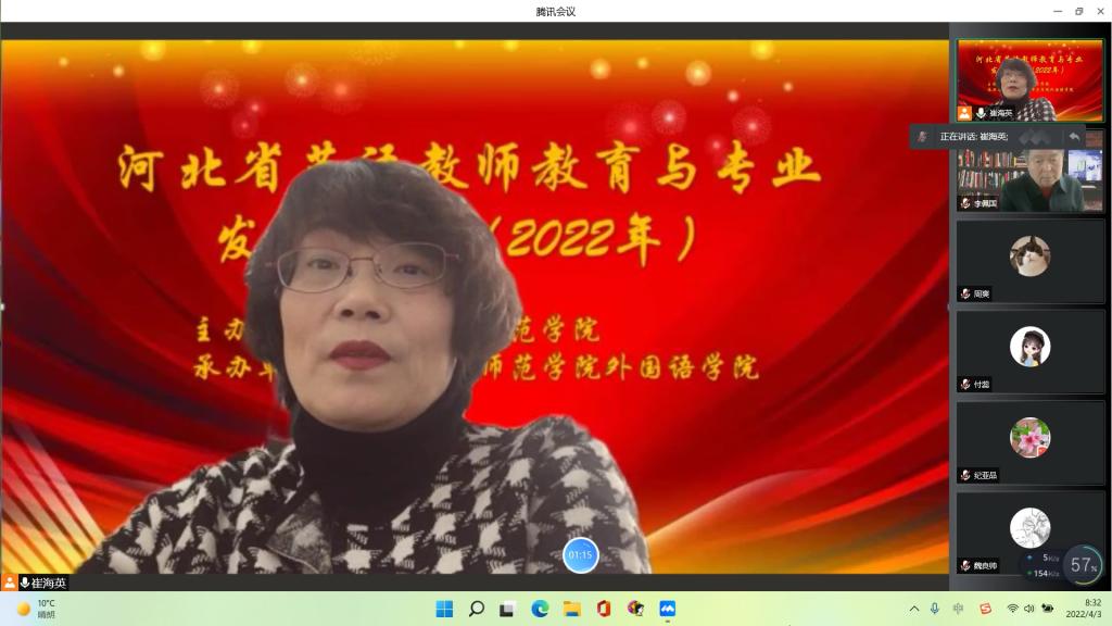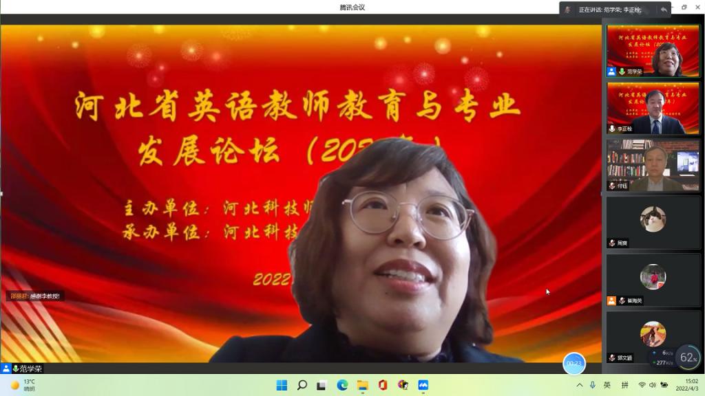 4月3日,由8455新葡萄场网站主办,8455新葡萄场网站8455新葡萄场网站承办的2022年河北省英语教师教育与专业发展论坛以腾讯会议形式线上召开,由8455新葡萄场网站崔海英院长和范学荣副院长主持,特邀全国著名师范院校的五名专家、一位基础教育学校校长共同探讨河北省英语教师教育与专业发展的议题。学校党委副书记李佩国教授致开幕辞。
