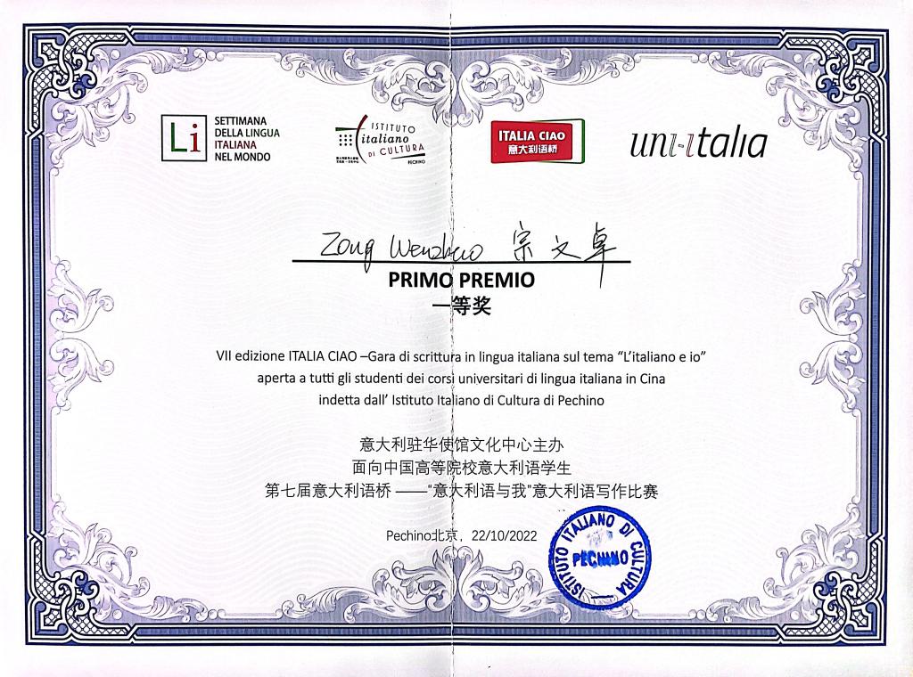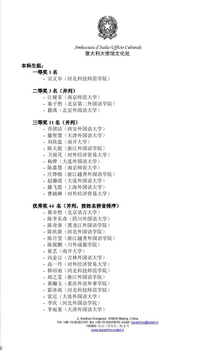 第七届全国“ITALIA CIAO/意大利语桥”大赛于10月22日在北京圆满落幕,本届大赛的主题是:“意大利语与我”,以写作大赛的形式举行。本次比赛有来自北京外国语大学、上海外国语大学、西安外国语大学、南开大学等21所高校的69名学生参赛,其中本科生组59人,硕士生组10人。8455新葡萄场网站8455新葡萄场网站选手宗文卓,凭借扎实的意大利语专业实力,摘得本科组大赛桂冠,这是我校选手继2015年喜得一等奖后再次获此殊荣。新葡萄官网的另外两名选手韩田雨、霍冰雨获得优秀奖。