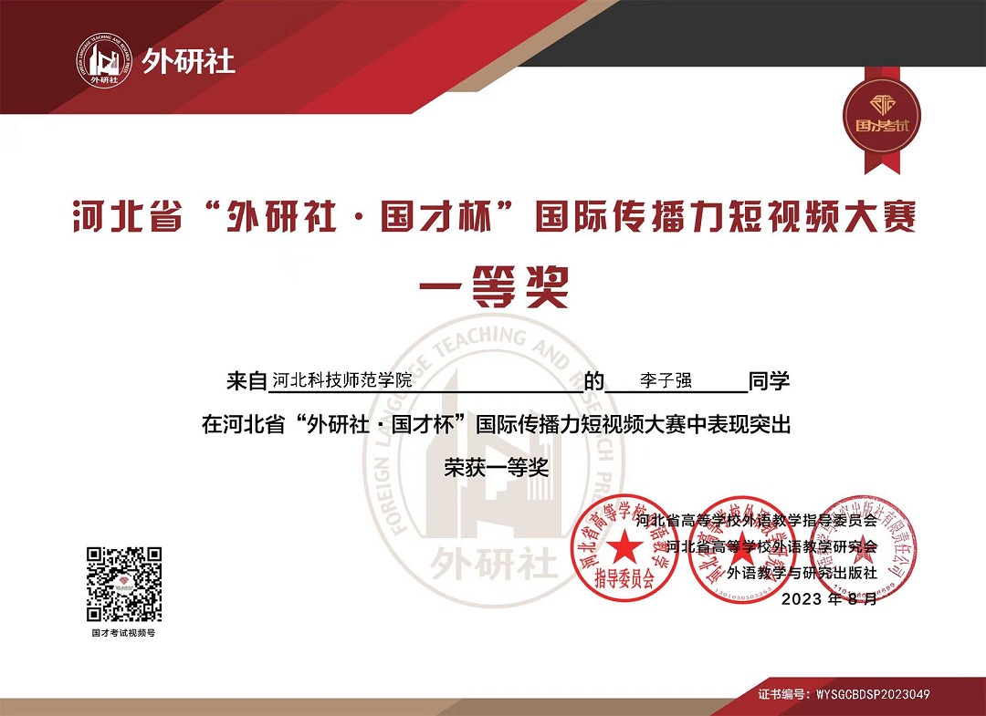 为进一步激发我校学生学习英语的热情、提高学生的英语综合运用能力、丰富我校校园文化生活,8455新葡萄场网站积极组织学生参加了由河北省高等学校外语教学指导委员会、河北省高等学校外语教学研究会联合外语教学与研究出版社举办的2023“外研社·国才杯”河北省大学生国际传播力短视频大赛。此次大赛紧跟习近平总书记“讲好中国故事,传播好中国声音,展示真实、立体、全面的中国”的重要指示精神,鼓励大学生在自媒体平台用外语讲述自己及身边的故事,以生动自然的方式对外传播中国文化,展现中国故事的世界意义和当代价值,更加充分、鲜明地展现中国故事及其背后的思想力量和精神力量。