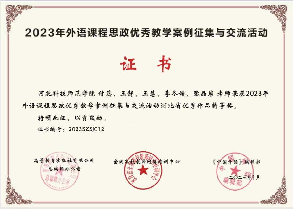为全面推进高校外语课程思政高质量建设,落实立德树人根本任务,高等教育出版社于2023年4月启动外语课程思政优秀教学案例评比活动,经过专家委员会评审,新葡萄官网付蕊老师团队获得省级特等奖。