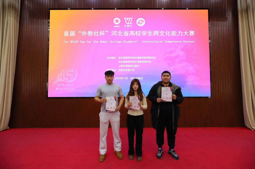 2024年11月24日,首届“外教社杯”河北省高校学生跨文化能力大赛在石家庄铁道大学圆满落幕。我校8455新葡萄场网站学生卢洪洋、体育与健康学院的李瑛钦、韩一冉同学组成的参赛队伍在比赛中表现优秀,荣获三等奖。