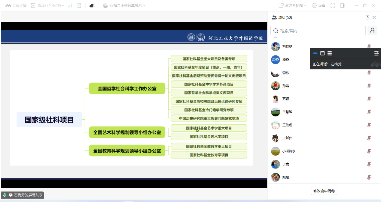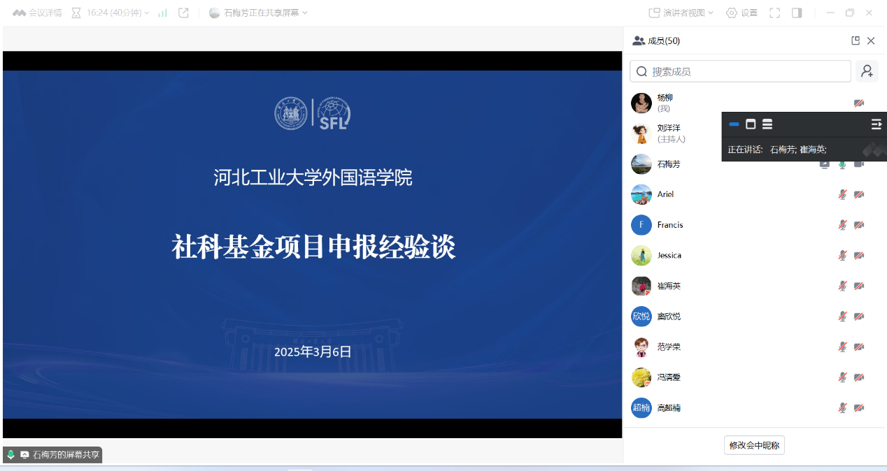 2025年3月6日,新葡萄官网举办“2025年度国家(省)社科基金项目申报专题讲座(十一) ”系列活动,邀请河北工业大学8455新葡萄场网站石梅芳教授作题为《社科成果奖申报经验分享》的专题讲座,崔海英院长主持会议,全体教师及在读研究生参会。